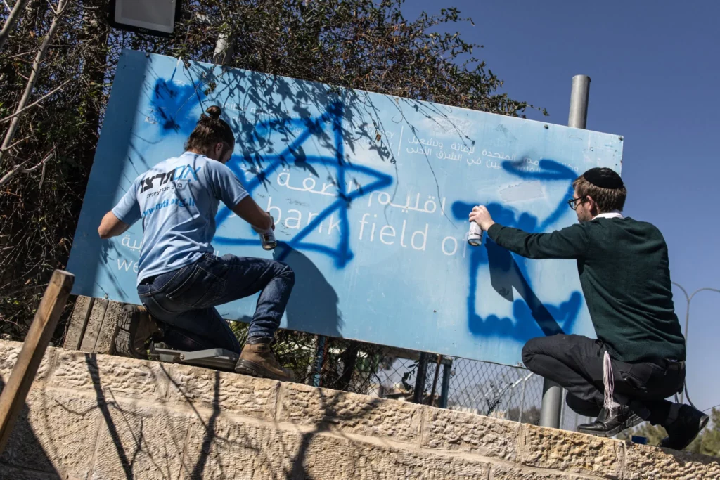 Activistas israelíes grafitean un cartel frente a la puerta cerrada de la oficina de campo de la UNRWA en Jerusalén en Judea y Samaria el 30 de enero de 2025 (JOHN WESSELS / AFP)