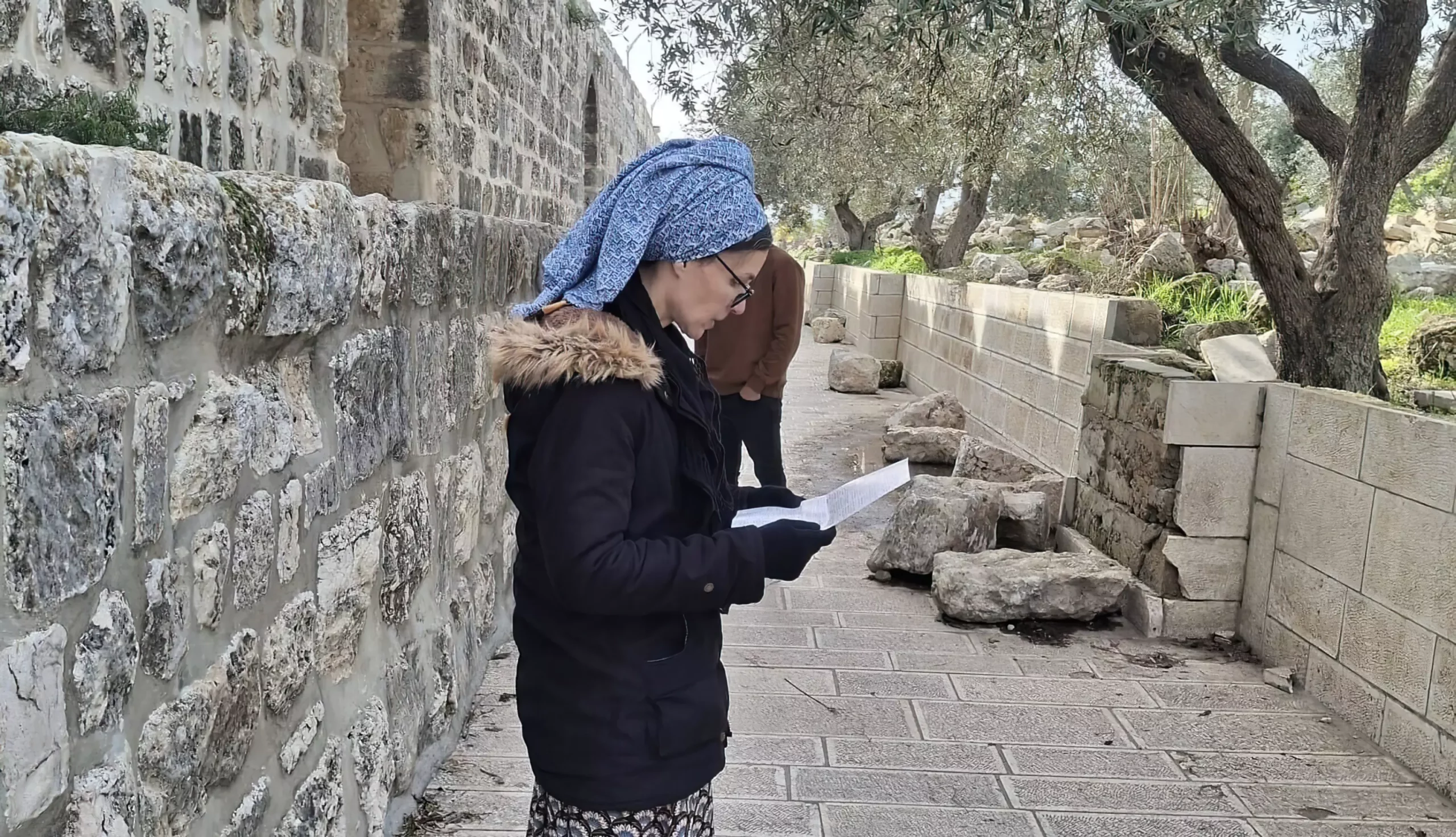 Una mujer recita oraciones de un folleto distribuido por la Yeshiva del Monte del Templo después de que la policía permitiera a los fieles judíos llevar el material litúrgico al Monte del Templo, en la Ciudad Vieja de Jerusalén, el 21 de enero de 2026. (Cortesía/Beyadenu)