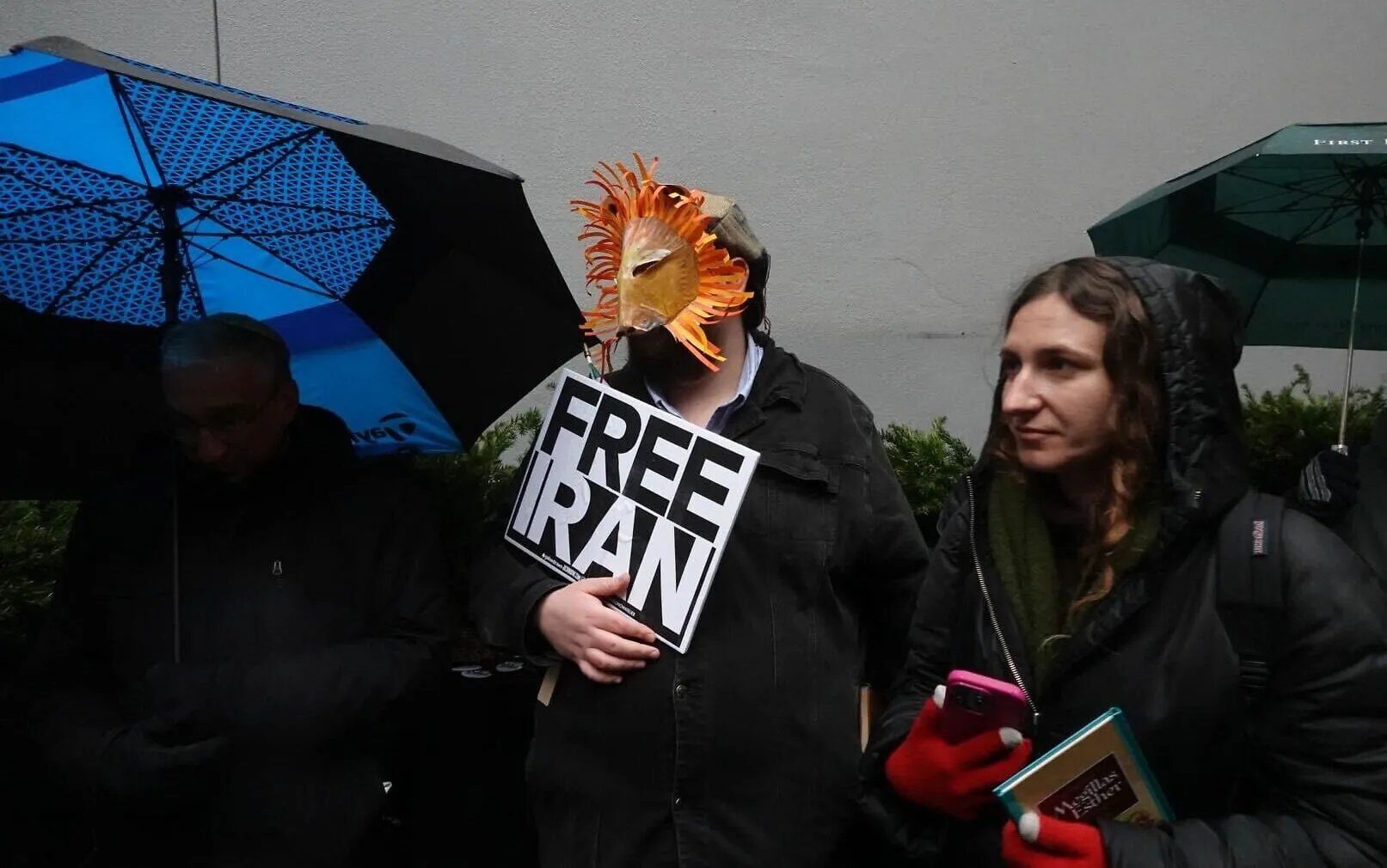 La convocatoria la organizó Hineni, un grupo judío de base con sede en la ciudad. Cerca de 30 asistentes se reunieron bajo la lluvia fría del invierno, sostuvieron banderas de Israel y de Irán, y mostraron carteles con el mensaje “Free Iran”, en el marco de la actividad.