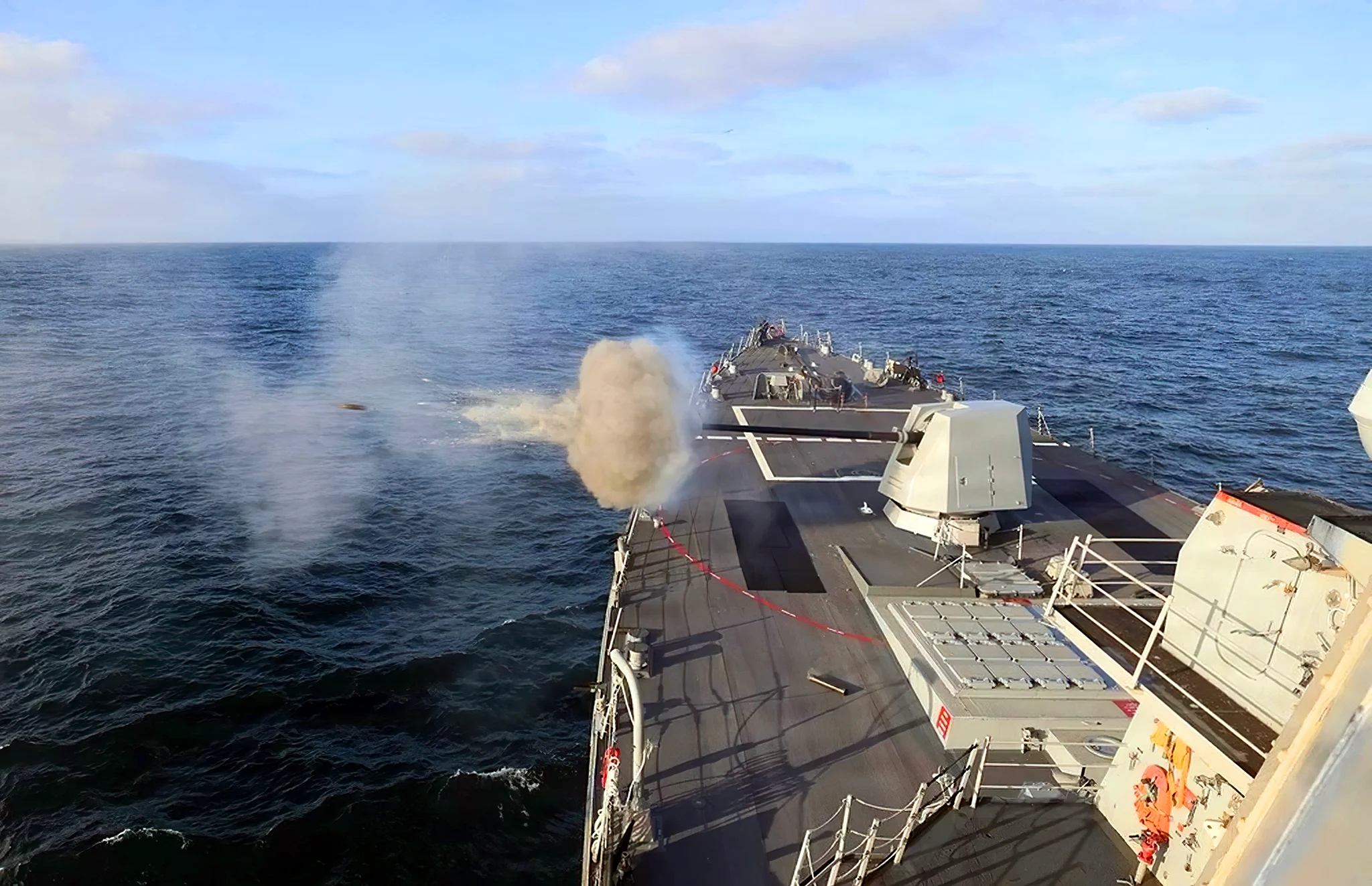 La capacidad de apoyo de fuego se basa en el cañón Mk 45 de 5 pulgadas. Aunque resulta menos visible que los radares y los lanzadores del Arleigh Burke, el sistema conserva relevancia operativa. Tripulaciones de la OTAN lo han empleado contra amenazas pequeñas o drones a un costo muy inferior al de los interceptores guiados. Con una cadencia cercana a veinte disparos por minuto y una reserva amplia de munición, proporciona fuego sostenido con una relación costo-eficacia que los misiles no alcanzan en las mismas condiciones.