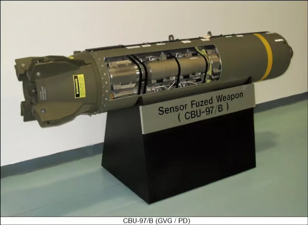 En cambio, la Munición Sensor Fuzed CBU-97 responde a una lógica distinta y con una complejidad tecnológica mayor. Sus submuniciones emplean sensores capaces de localizar y atacar vehículos concretos, en lugar de basarse en efectos de área no guiados. Esa diferencia modifica el tipo de blanco esperado y también el modo en que se interpreta la presencia de la carga, porque desplaza el foco desde el minado del terreno hacia el golpe directo contra objetivos móviles.