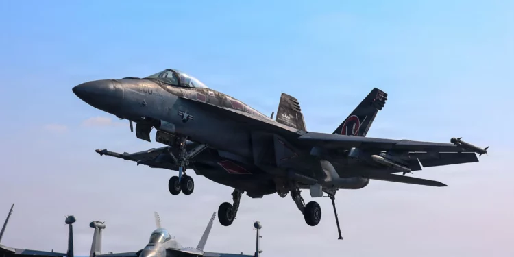 Con dos portaaviones en el área, los Super Hornet sostienen la defensa antiaérea y aportan ataque inmediato, sin depender de bases ni permisos de sobrevuelo.