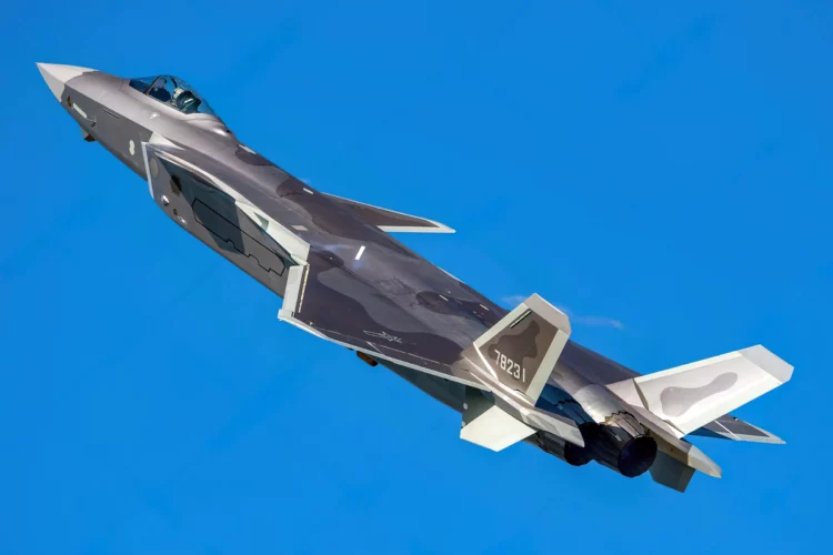 El J-20 es un avión de combate furtivo de quinta generación desarrollado por la Chengdu Aerospace Corporation. Alcanza una velocidad máxima de Mach 2,5 y tiene un alcance de unos 3.000 kilómetros. Está equipado con tecnología furtiva que dificulta su detección por radar y está armado con varios misiles aire-aire y aire-superficie, así como con un cañón de 30 mm. Su diseño se orienta a misiones de superioridad aérea y funciones de ataque a tierra.