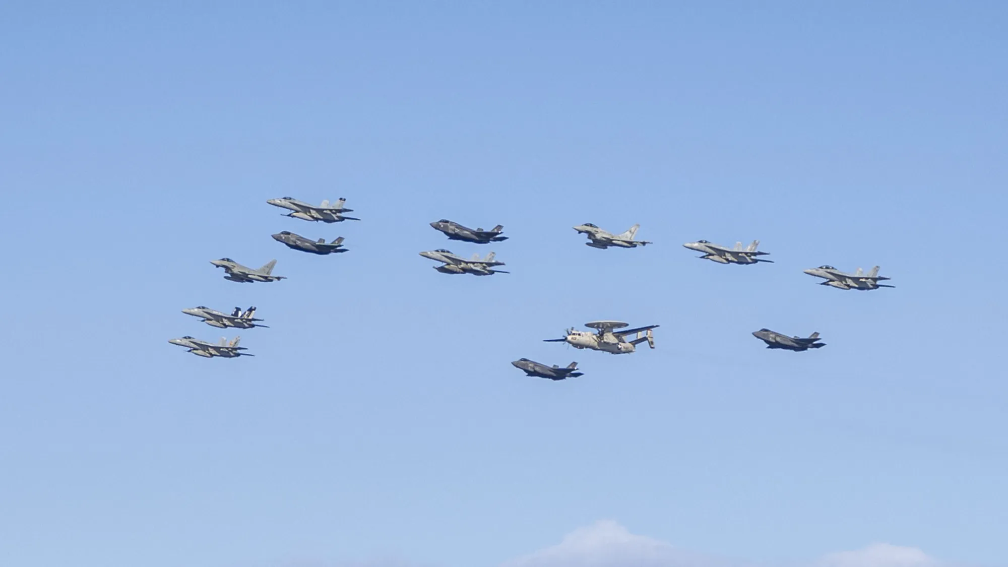 La imagen inicial, recortada, muestra en detalle la formación aérea sobre el USS Gerald R. Ford (CVN 78). (Foto de la Armada de EE. UU. tomada por el especialista en comunicación de masas de segunda clase Jacob Mattingly)