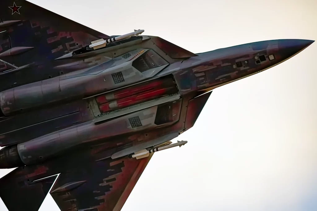 En notas publicadas por Army Recognition y medios rusos se afirma que las bahías laterales contienen misiles de corto alcance RVV-MD, una disposición coherente con la configuración conocida del Su-57. El caza combina dos bahías principales en tándem bajo el fuselaje y dos compartimentos laterales próximos a la raíz alar, lo que estructura el reparto de cargas aire-aire y aire-superficie con exposición externa mínima, según las descripciones técnicas difundidas en notas.