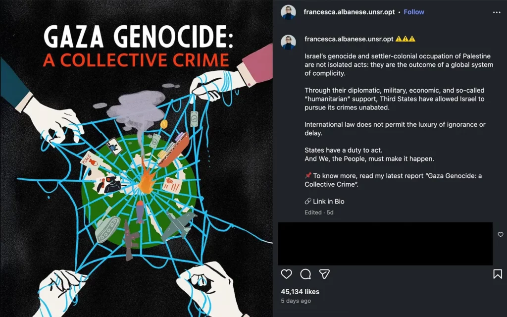 Una caricatura que el Relator Especial de la ONU, Albanese, publicó en Instagram, el 29 de octubre de 2025. (Captura de pantalla)