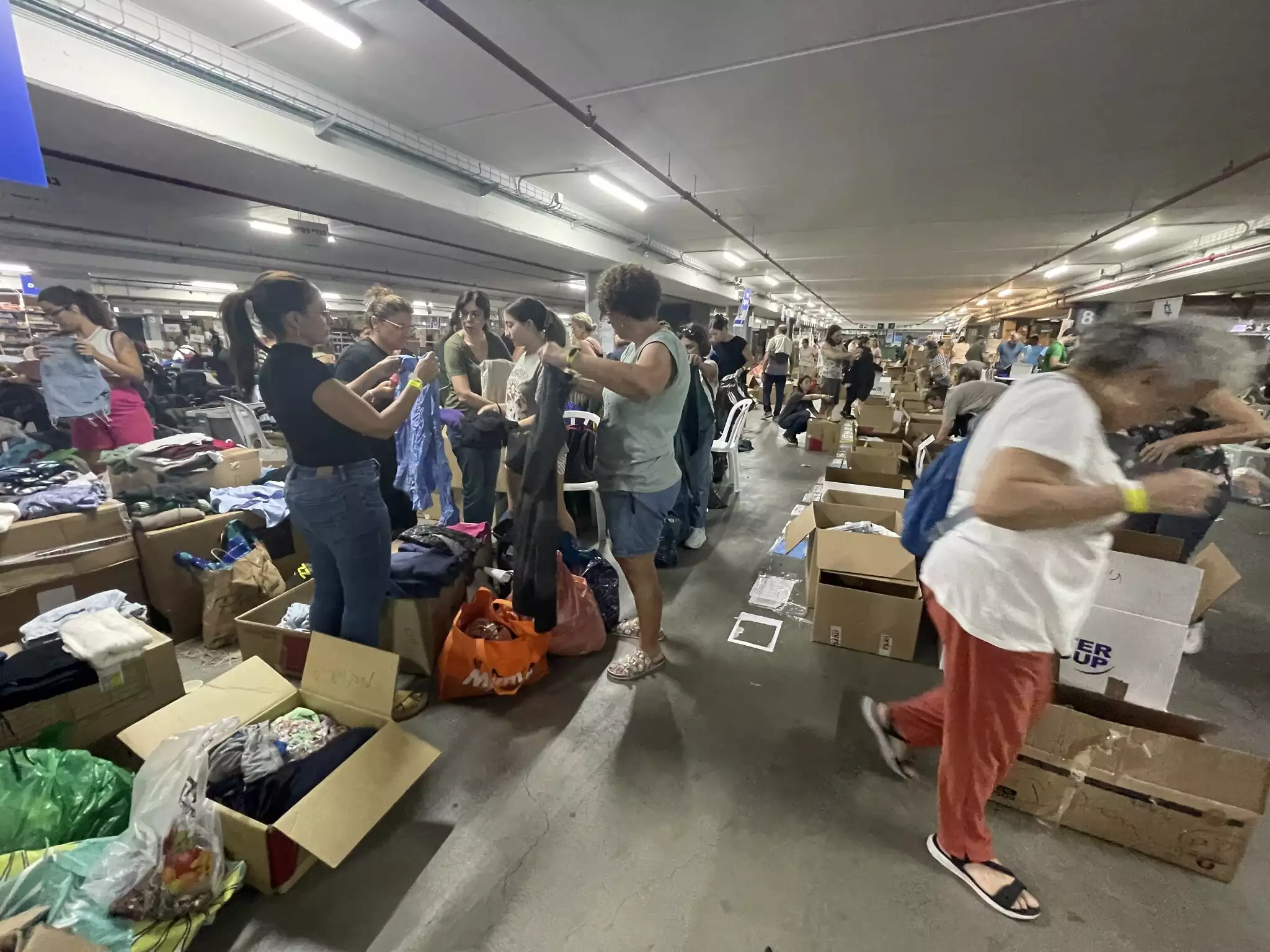 Voluntarios ayudan a clasificar y empaquetar artículos donados en el Centro de Operaciones Civiles, Expo Tel Aviv, 19 de octubre de 2023. (Sue Surkes/Times of Israel)