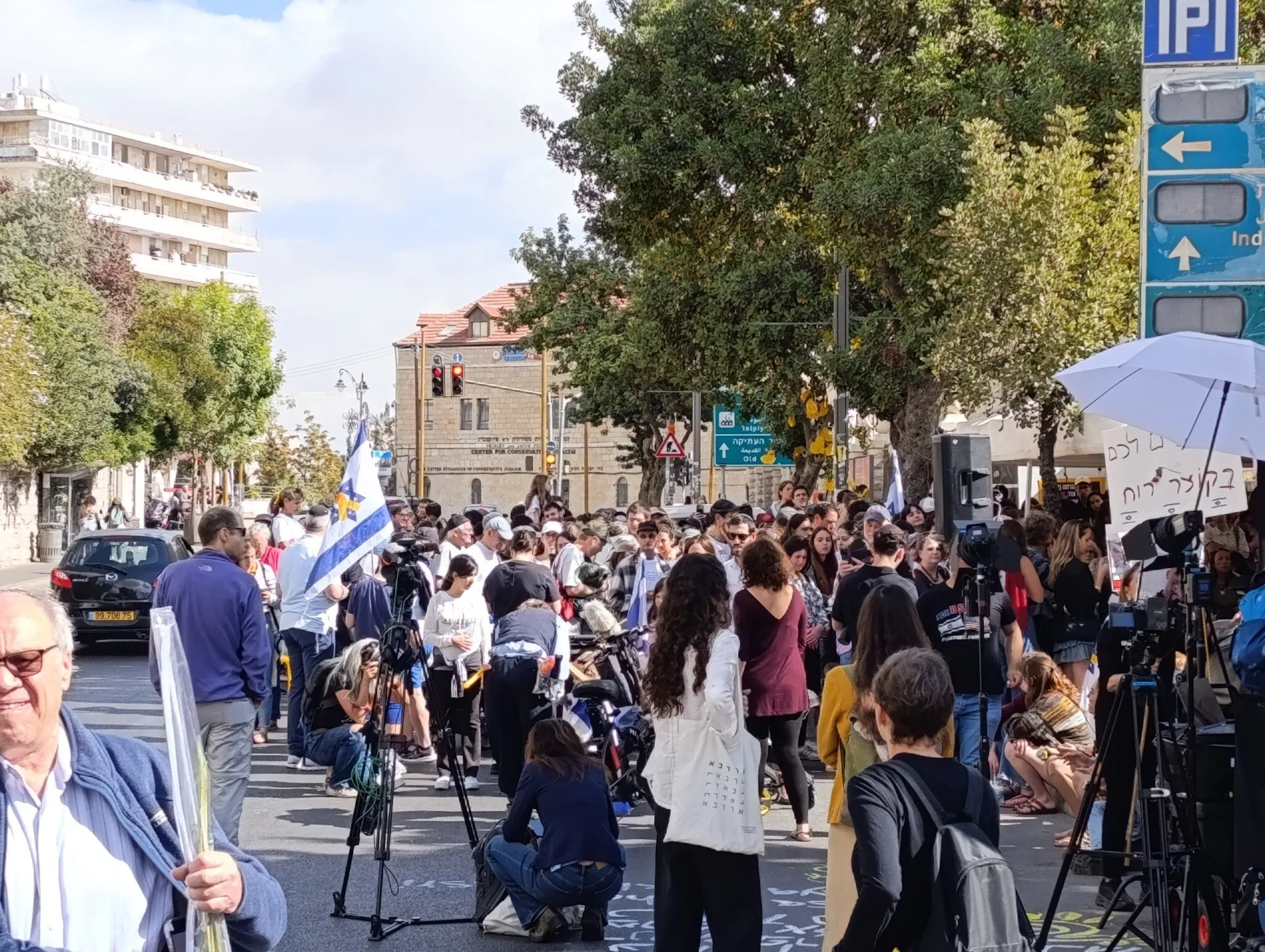 En Jerusalén, unas 200 personas reunidas en la carpa de protesta frente a la residencia oficial del primer ministro en la calle Balfour celebraron al ver por primera vez a los rehenes liberados de Gaza. La carpa, que ha sido escenario de múltiples manifestaciones en los últimos dos años, contaba con una gran pantalla que transmitía la liberación. La calle Azza cercana permaneció tranquila, con peatones regresando de las oraciones matutinas en el último día de Sucot.