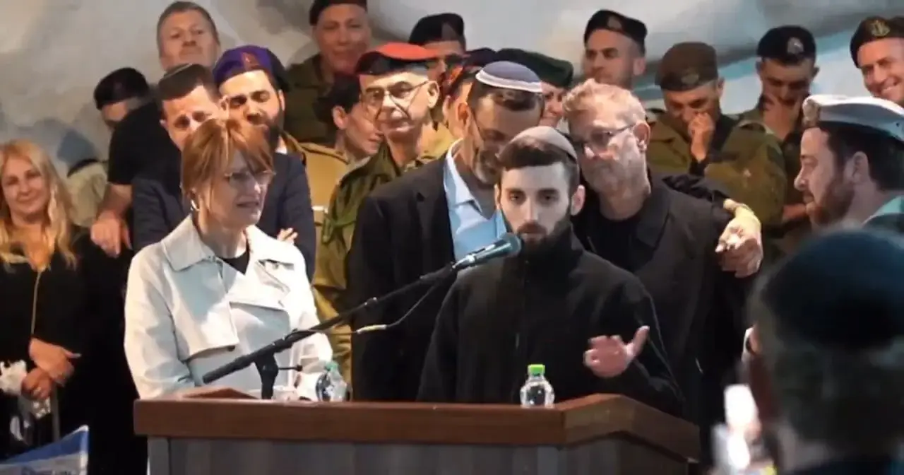 Matan Angrest, único superviviente de la tripulación de su tanque, estuvo cautivo durante dos años antes de ser liberado el mes pasado. Pronunció un emotivo elogio fúnebre a su camarada caído, el sargento Itay Chen, después de que sus restos fueran repatriados a Israel anoche.