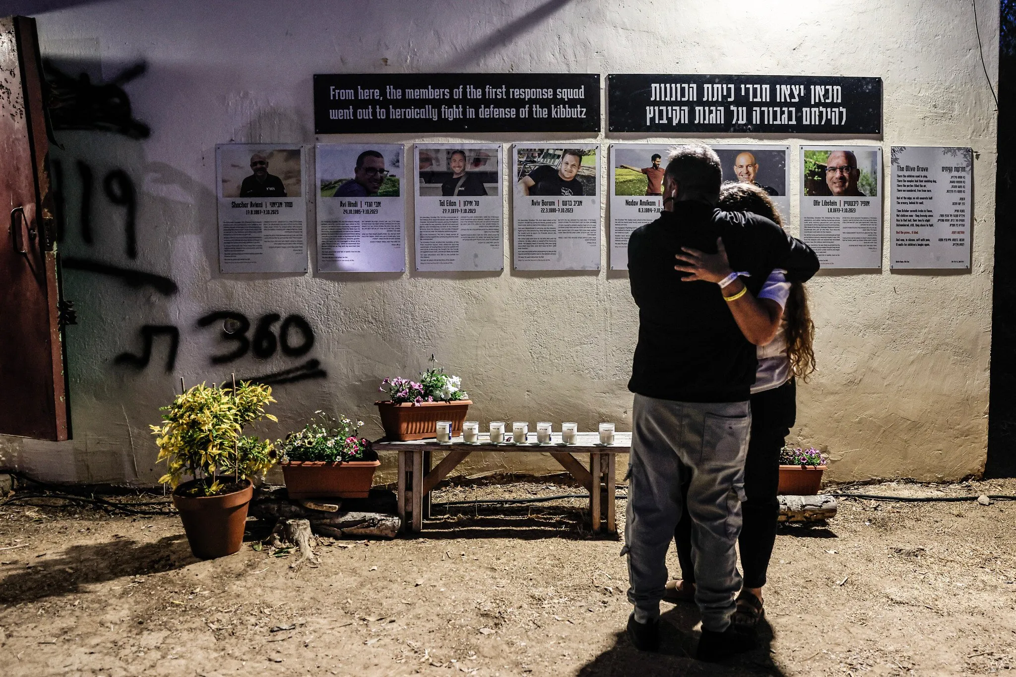 Los supervivientes del kibutz Kfar Aza se reunieron el jueves en el cementerio para un monumento a las víctimas del ataque del 7 de octubre de 2023. Personas colocaron flores en las tumbas y, según la costumbre judía, depositaron piedras. Los supervivientes leyeron los nombres de las 64 víctimas, mientras el ruido de helicópteros y drones a veces impedía oír sus voces.
