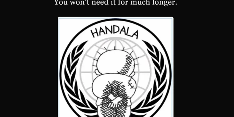 La página intervenida muestra además la imagen de Handala, uno de los símbolos más reconocibles de la resistencia palestina. El personaje fue creado en 1969 por el caricaturista palestino Naji al-Ali y desde entonces ha sido adoptado de forma amplia por el movimiento nacional palestino.