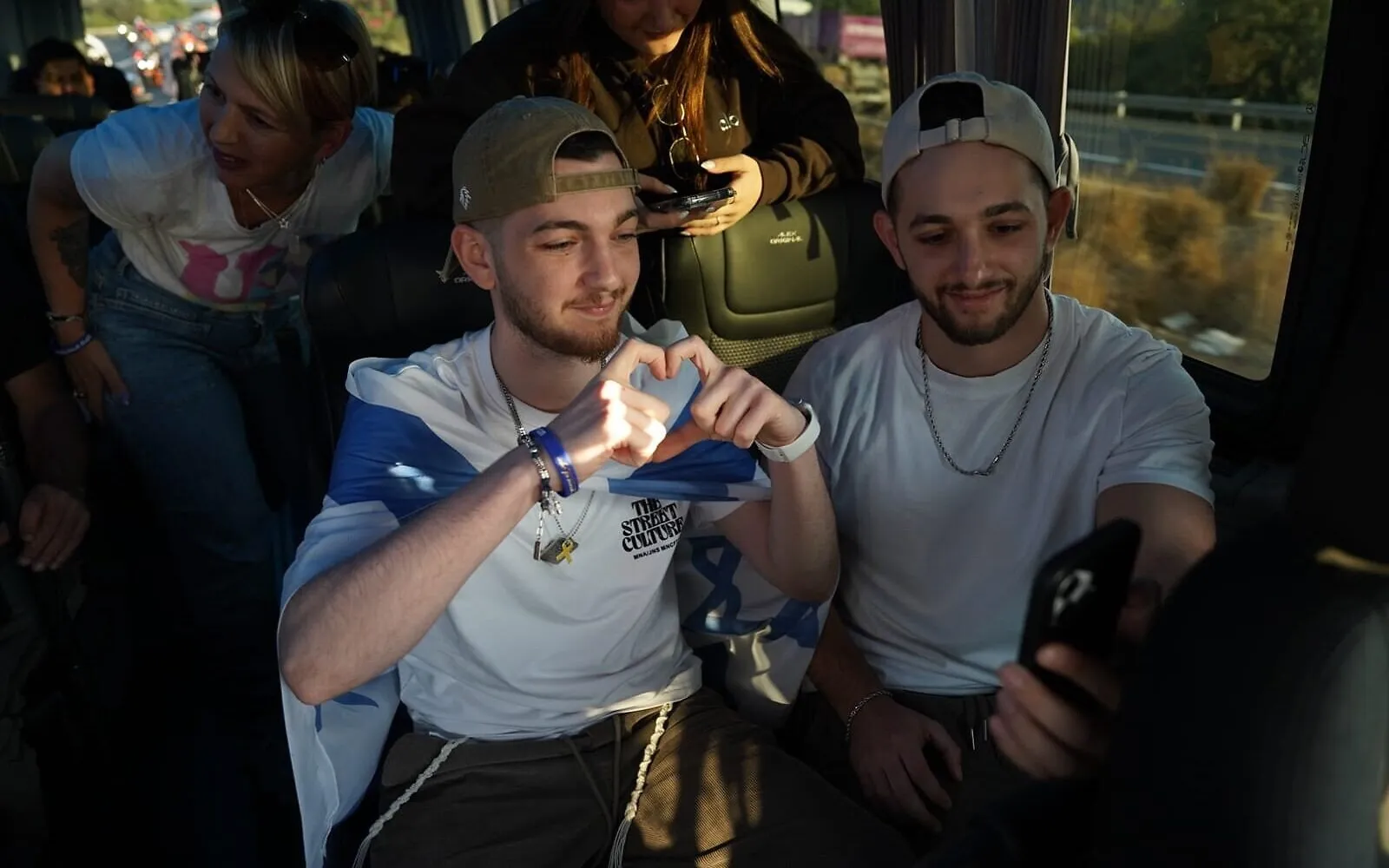 Multitudes lo aclaman y ocupan cada espacio junto a la camioneta que traslada al rehén liberado Bar Kuperstein a su hogar en la ciudad central de Holon, tras dos años de cautiverio en Gaza. El vehículo avanza con dificultad y vecinos salen a la calle para recibirlo.
