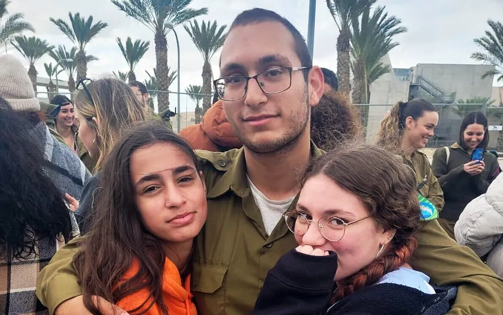 Tamir Nimrodi, en el centro, tomado como rehén de su base militar el 7 de octubre de 2023, con sus dos hermanas menores, Mika, a la izquierda, y Amit (cortesía)
