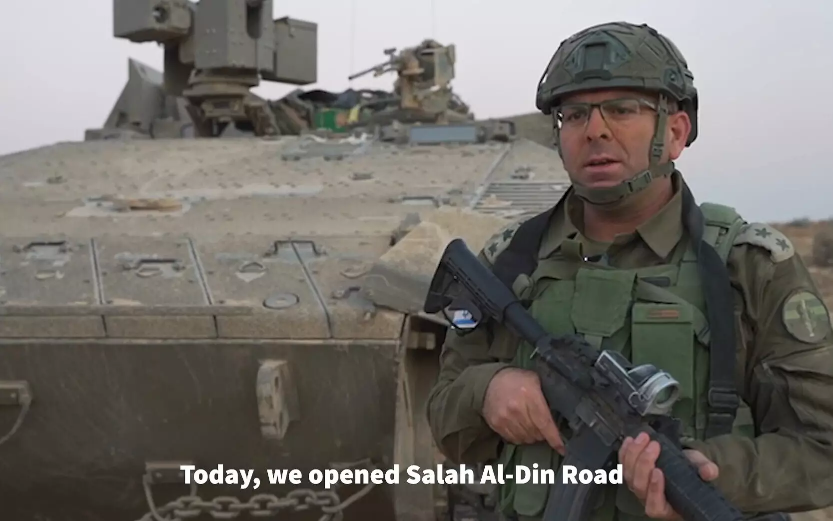 “Hoy hemos abierto la carretera de Salah a-Din como corredor humanitario para los civiles del norte de la Franja de Gaza”, dice el coronel Moshe Tetro desde la carretera, cerca del barrio Zeitoun de la ciudad de Gaza.