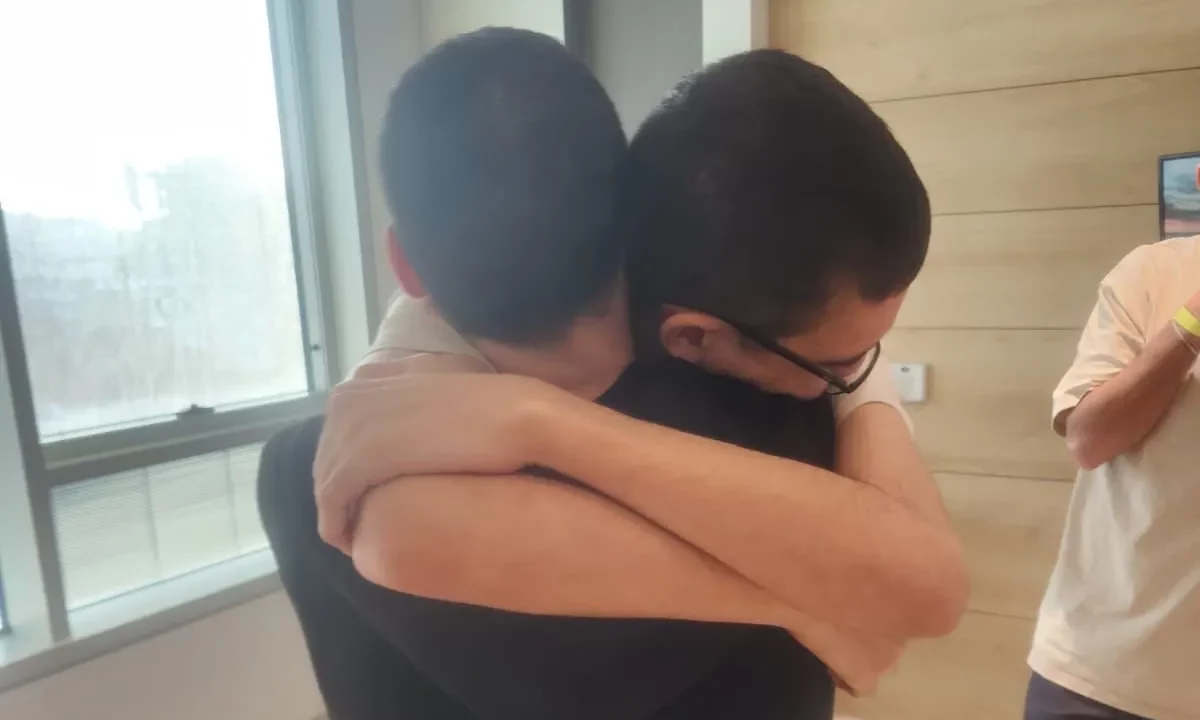 Los exrehenes Evyatar David y Guy Gilboa-Dalal, amigos de la infancia que permanecieron más de dos años cautivos de Hamás, se reencontraron en el Centro Médico Rabin de Petah Tikva tras su regreso a Israel.