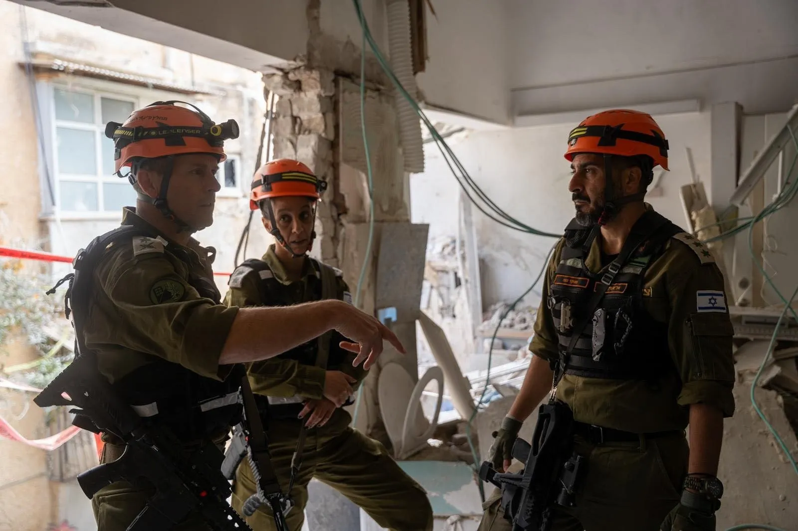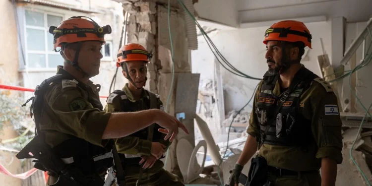 El jefe del Comando del Frente Interior, el mayor general Shai Klapper (izquierda), junto a otros oficiales, en una vivienda del centro de Israel alcanzada por una bomba de racimo iraní, el 9 de marzo de 2026. (Fuerzas de Defensa de Israel)