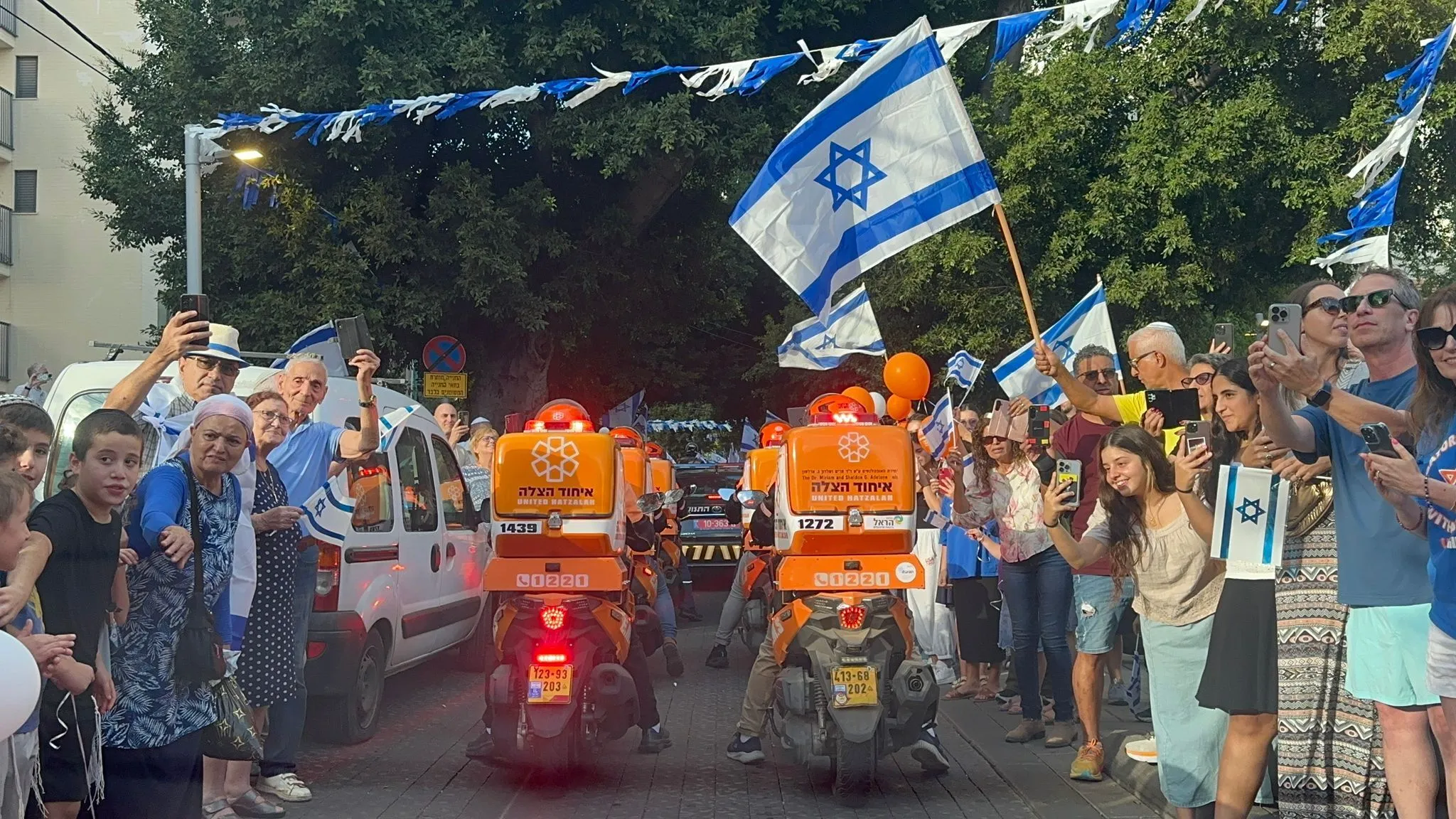 Cuando el rehén liberado Evyatar David regresó hoy a su casa en Kfar Saba, lo acompañó un grupo de médicos voluntarios de United Hatzalah en sus característicos vehículos de emergencia naranjas.