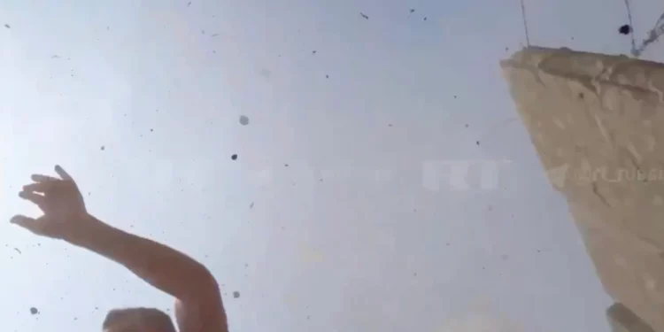 Las imágenes captaron el momento en que el reportero se aparta ligeramente tras oír un fuerte zumbido, apenas segundos antes del impacto. La fuerza de la explosión hace que la cámara parezca caer al suelo.