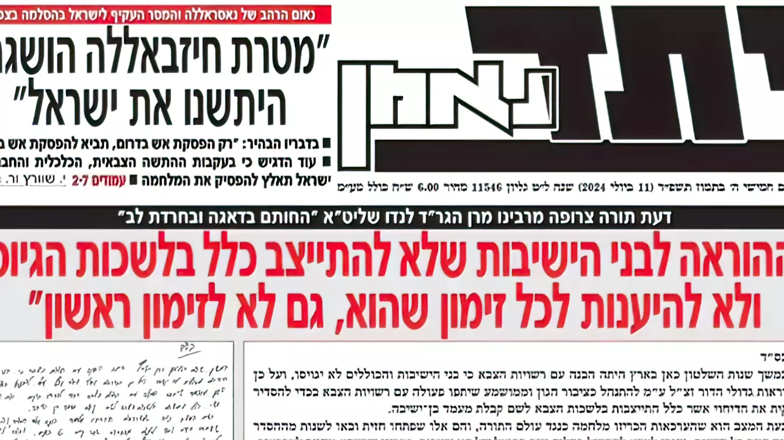 Sobre la portada de julio de 2024 que decía “Declaración de guerra”, difundida tras el llamado del rabino Dov Lando a los alumnos de yeshivá para que no acudieran a las oficinas de reclutamiento de las FDI, Friedman explicó que el rabino Lando “quería que el mensaje fuera preciso: era una declaración de guerra”.