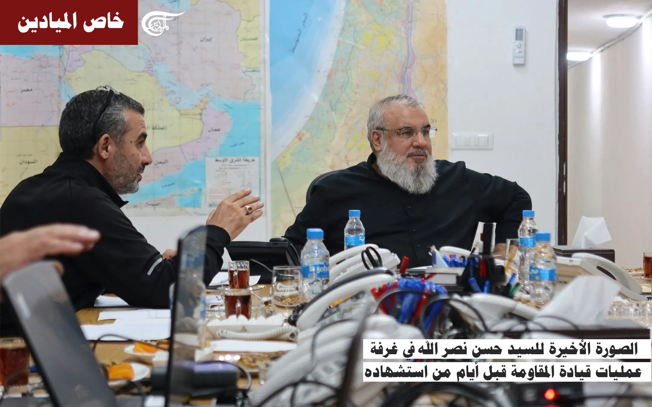 Nasrallah aparece en la “sala de operaciones de comando” de Hezbolá, días antes de ser asesinado en un ataque aéreo israelí, según Al-Mayadeen.