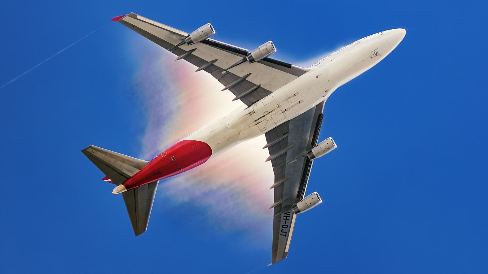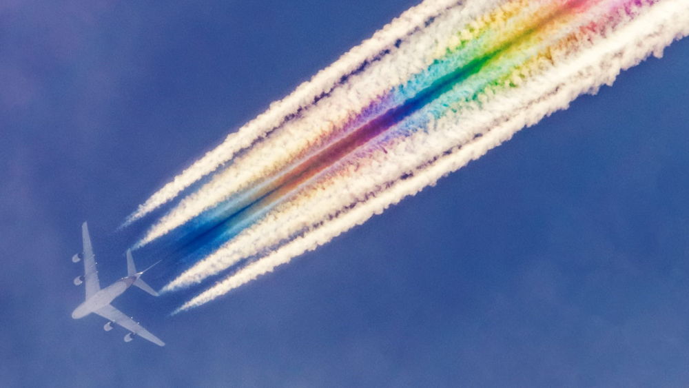 Un avión surca a través de las nubes, un rastro de estelas tecnicolores que lo siguen, iluminando el cielo en deslumbrantes sombras de arco iris.