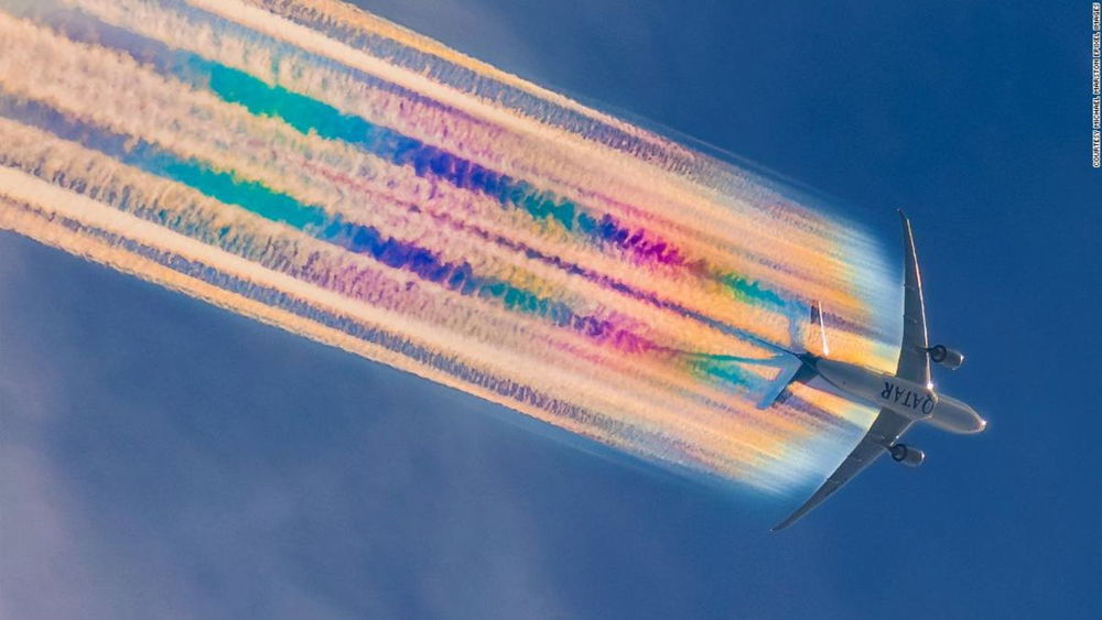 “Noté que los aviones se ven muy bonitos cuando sobrevuelan con las condiciones atmosféricas adecuadas – producen arco iris detrás de ellos, con el vapor”, le dijo Marston a CNN Travel.