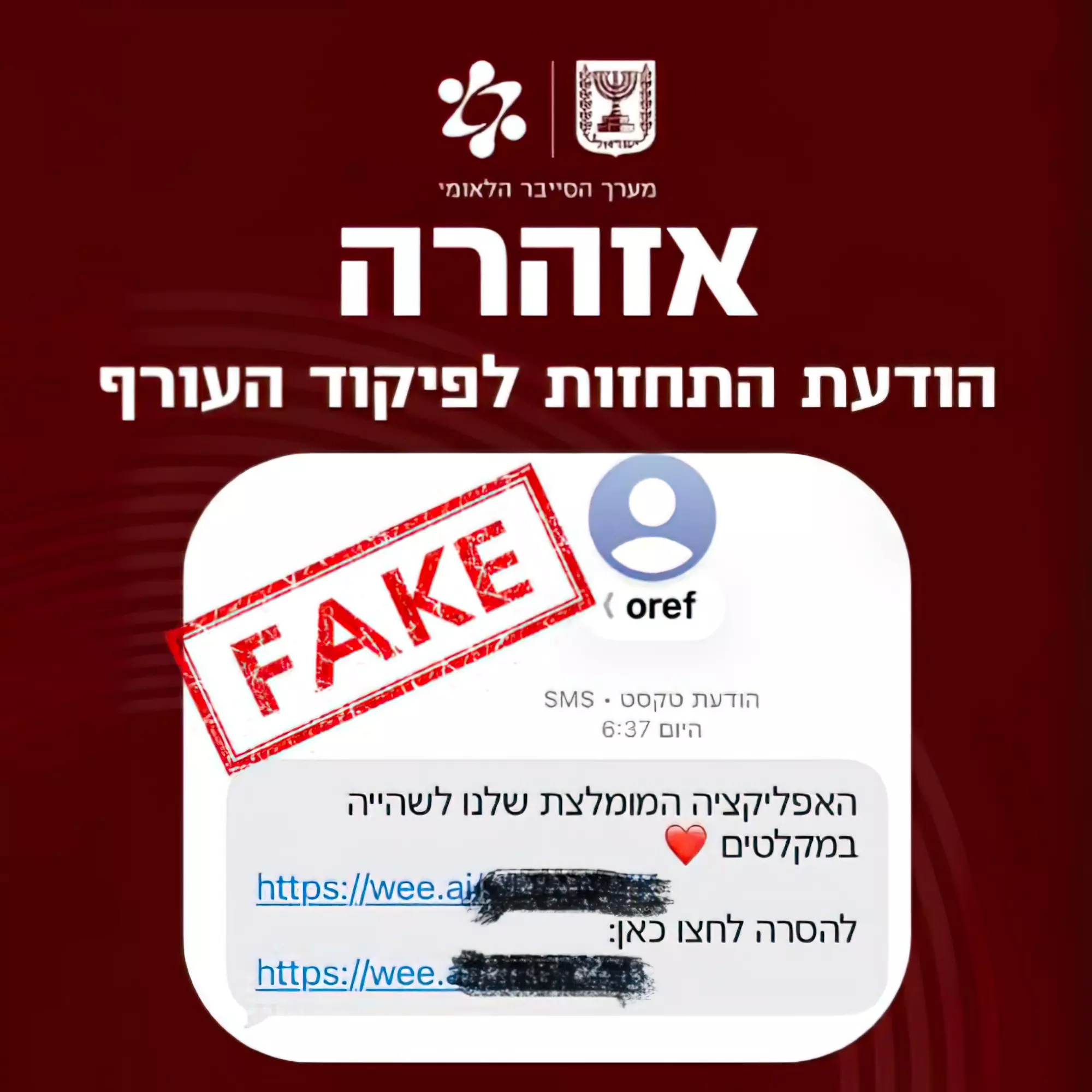 La Dirección Nacional de Ciberseguridad de Israel advirtió que algunos ciudadanos recibieron esta mañana mensajes que aparentaban haber sido enviados por el Mando del Frente Interno, pero que en realidad formaban parte de un intento de phishing.
