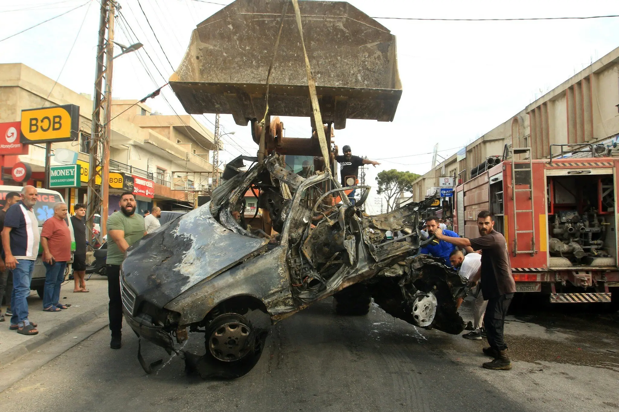 Una excavadora retira los restos de un vehículo objetivo de un ataque con dron israelí en la aldea de Doueir, en el sur del Líbano, cerca de la ciudad de Nabatiyeh, el 3 de noviembre de 2025. (Mahmoud ZAYYAT / AFP)